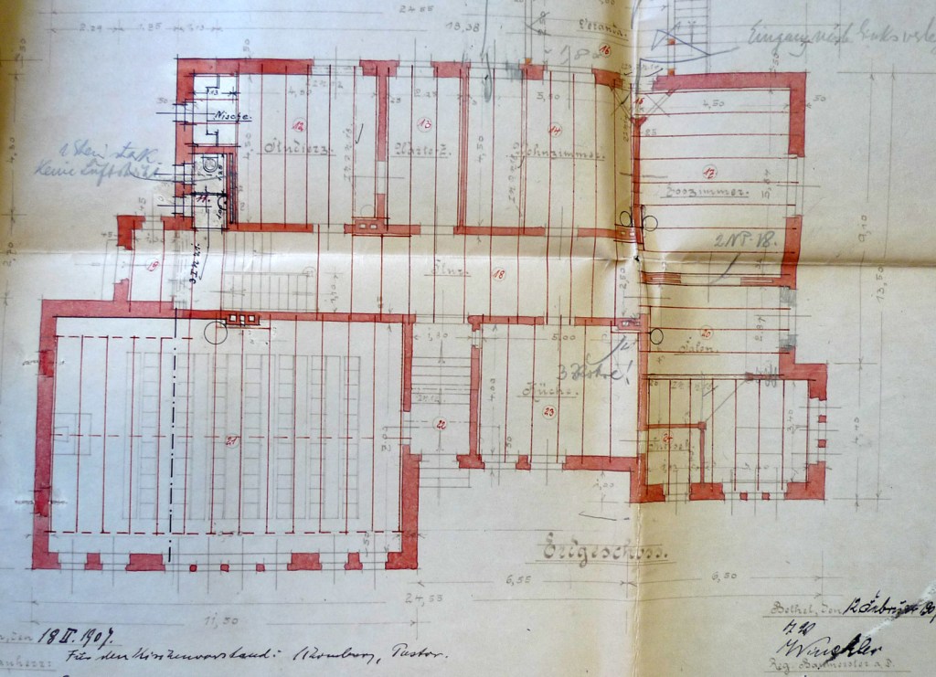 Das Pfarrhaus sollte sowohl dem kirchlichen wie dem profanen bürgerlichen Leben des Pfarrers mit seiner Familie dienen. Die Pläne waren großzügig: 40 Zimmer über drei Etagen listete der Bauantrag auf, wobei die Zählung auch Keller- und Abstellräume umfasste. Im Erdgeschoss bildete der Gemeindesaal das Herzstück. (20) Er bot laut Zeichnung Platz für 77 Personen in festen Bankreihen. Die Bauunterlagen zeigen, dass vor allem die Konfirmanden den Raum nutzen sollten. Ebenso befanden sich im Erdgeschoss die Räume, die der Pfarrer zu seinem öffentlichen Leben nutzte: eine Küche, ein Studierzimmer zum Schreiben der Predigten, sowie ein großes Wohn- und Esszimmer. Darüber, im ersten Geschoss lagen die privaten Räume – die Schlafzimmer für Eltern, Kinder, das Hausmädchen und Gäste (Fremdenzimmer). Sie hatten ein Bad mit Badewanne zur Verfügung. Dach und Keller waren vor allem für die Hauswirtschaft vorgesehen: Sie enthielten einen Kohlen- und Gemüsekeller, eine Plättstube und eine Rumpelkammer.