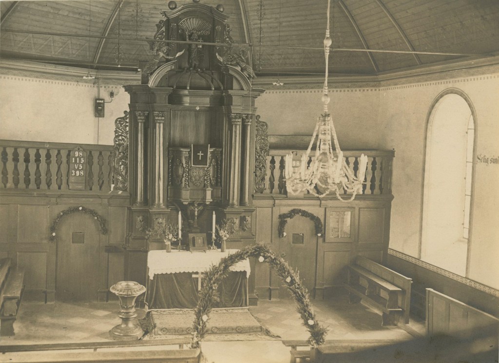 Evangelische Erlöser-Kirche in Boffzen, erbaut 1730-37, mit Blick auf den Kronleuchter, der von der Glashütte Rottmünde 1858 gestiftet wurde. (1) Foto: Privatsammlung Stephan Brandt