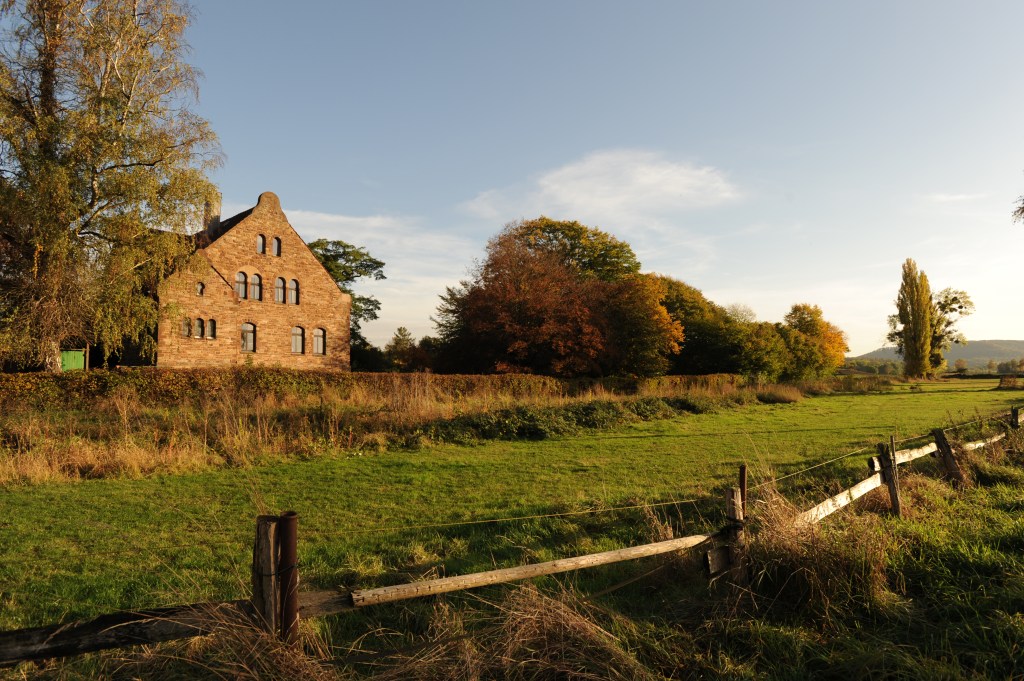 Das Pfarrhaus von der Weserseite im Herbst 2020 und der verschneite Pfarrgarten mit dem Wilhelm-Raabe-Tisch 2016. Fotos: Stefanie Waske