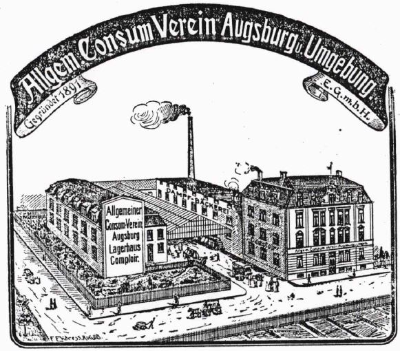 Zentrale Einrichtungen in jeder Stadt: Verwaltung, Großhandelslager und Bäckerei des Allgemeinen Consum-Vereins Augsburg und Umgebung 1906 (Frauen-Genossenschaftsblatt 6, 1907, 101)