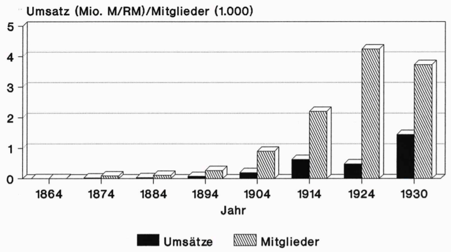 Mitglieder- und Umsatzbewegung der führenden Konsumvereinsverbände 1864-1930 (berechnet n. Erwin Hasselmann, Geschichte der deutschen Konsumgenossenschaften, Frankfurt a.M. 1971, 705-709)