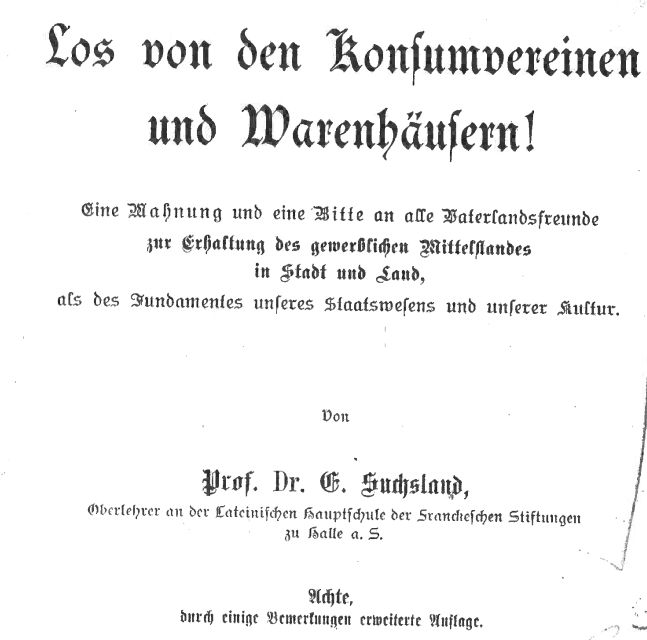 Mittelständisches Pamphlet gegen neue Betriebsformen im Handel 1904 (E[mil] Suchsland, Los von den Konsumvereinen und Warenhäusern!, 8. erw. Aufl., Halle a.d.S. 1904, I)