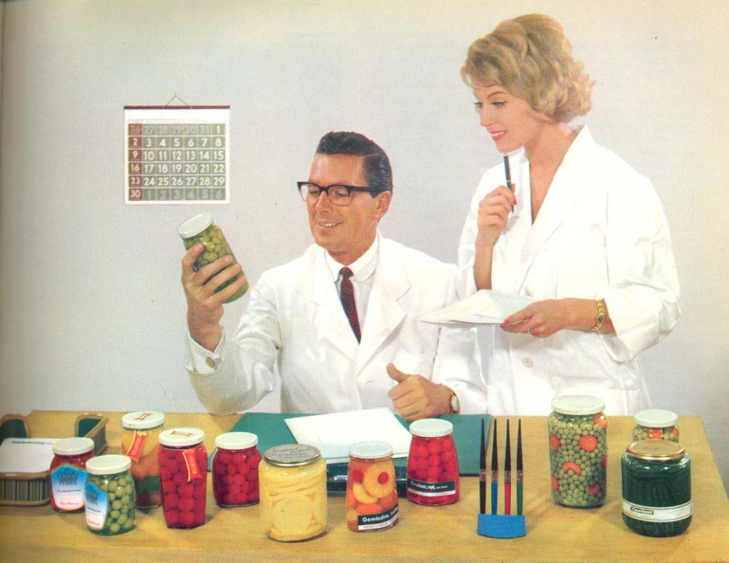 Dieser Bedeutungsgewinn war begleitet von intensiven Tests und wissenschaftlicher Grundlagenforschung, um Lebensmittel in einer Verpackung möglichst attraktiv zu präsentieren. Spargel schön nebeneinander, parallel und in gleicher Länge. Kirschen gut verteilt, mit gleichem Abstand, ohne Quetschungen am Boden. Konfitüre ohne Zuckerkranz. Sülze mit nur geringer Fettablagerung unterm Deckel. Jedes Lebensmittel erforderte präzises biochemisches Wissen – und anschließend eine passgenaue Verpackungsvariante durch die Glasindustrie.
