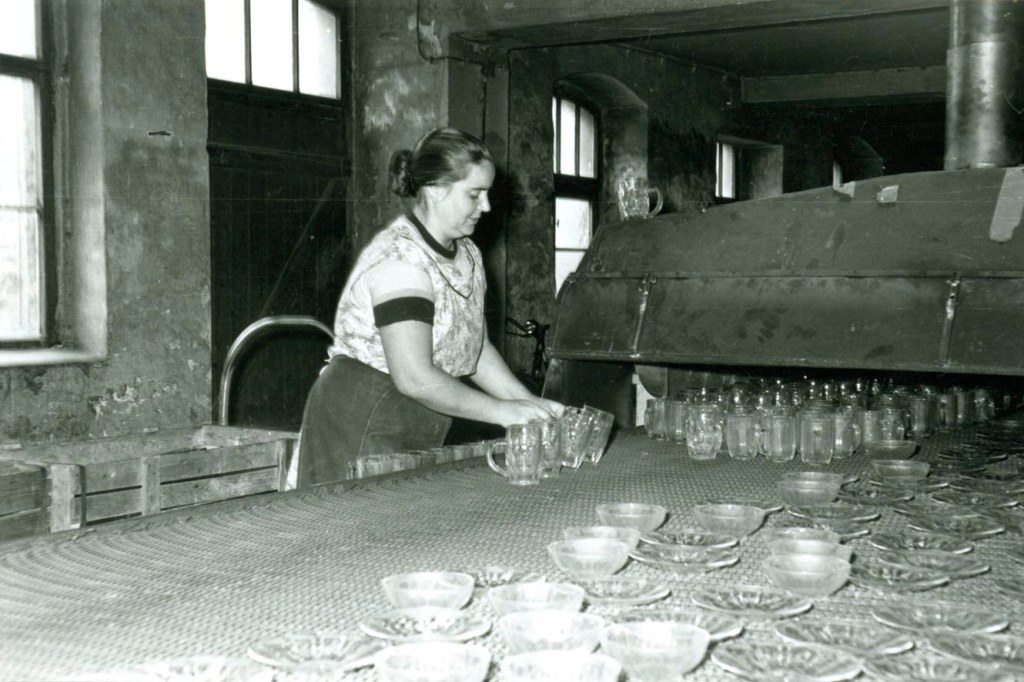 Fertig? Nun, nicht ganz. Glasschleifer entfernten noch die letzten Spuren der Herstellung, etwa die Unebenheiten des Bodens. Zudem bekamen manche Seidel noch einen Siebdruck (Abbildung 8), einen Goldrand oder ähnliche Dekoration. Bis der Biertrinker zum Seidel greifen konnte, waren demnach viele Arbeitsschritte notwendig. Die Arbeiter wurden nach Akkord bezahlt, schafften in den 1950er und 1960er Jahren bis zu 1000 Seidel pro Tag. Eine harte kraftzehrende Arbeit, daran erinnern sich die ehemalige Mitarbeiter der Georgshütte, Dieter Sterzel und Willi Sporleder.