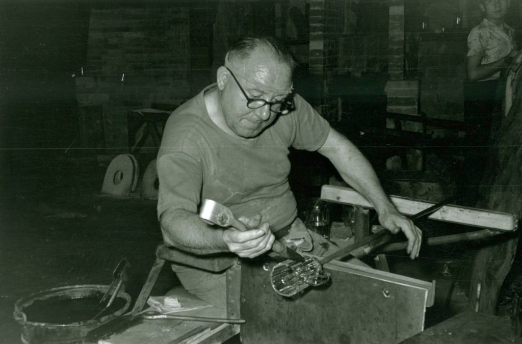 6: Fertigmacher Wilhelm Becker bearbeitet ein Bierglas mit der Zange. Foto: Detlef Knop