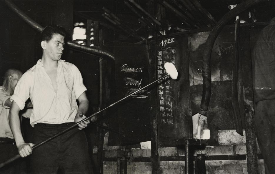 Ganz gleich, wie das Glas später verarbeitet wurde, mussten die Rohstoffe – vor allem Sand, Soda, Kalk, Feldspat – und recycelte Glasscherben zunächst bei bis zu 1600 Grad Celsius im Ofen zu einer zähflüssigen Masse schmelzen. Die geschmolzene Glasmasse stand dann in der sogenannten Arbeitswanne für die Herstellung zur Verfügung.