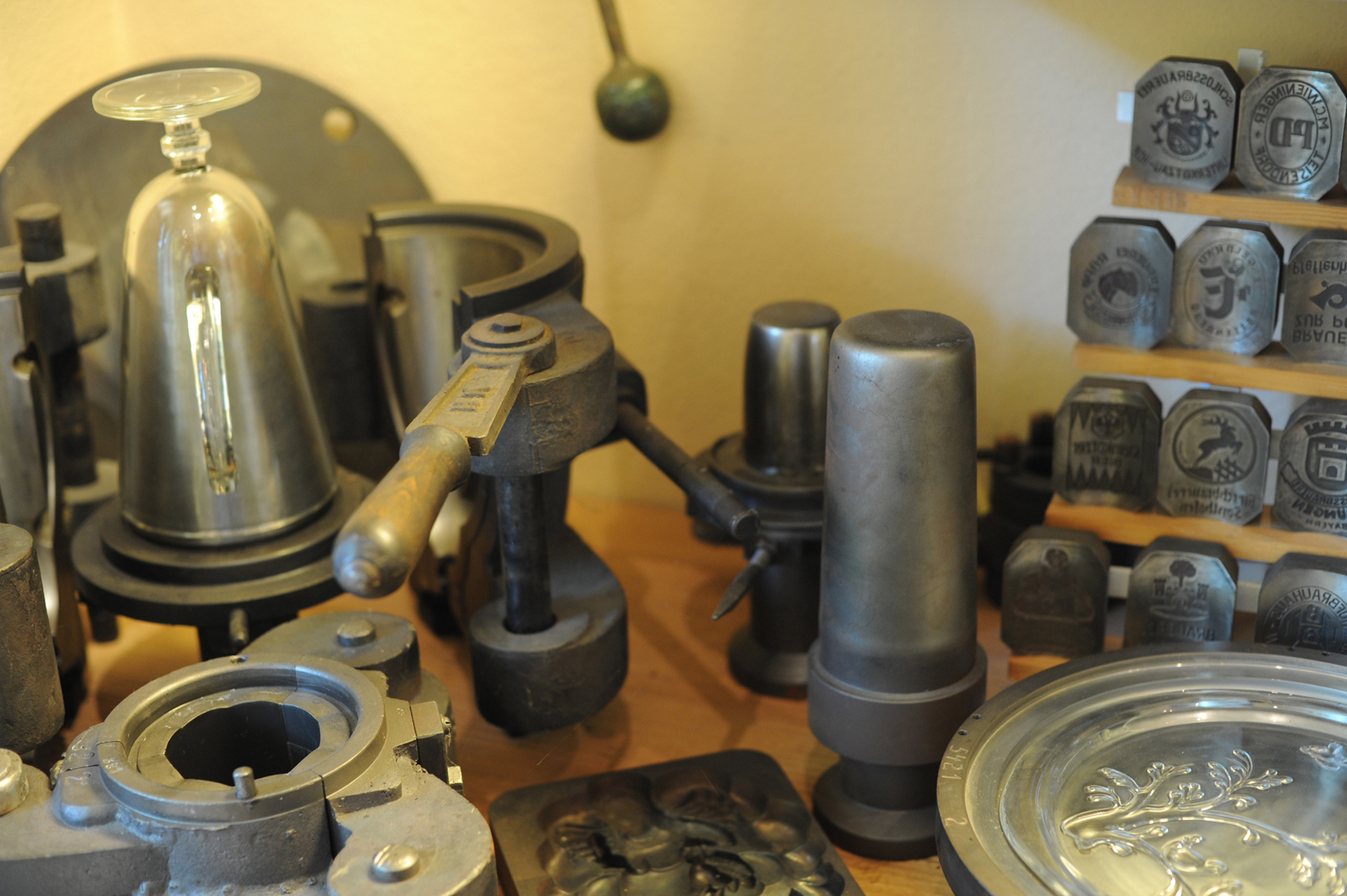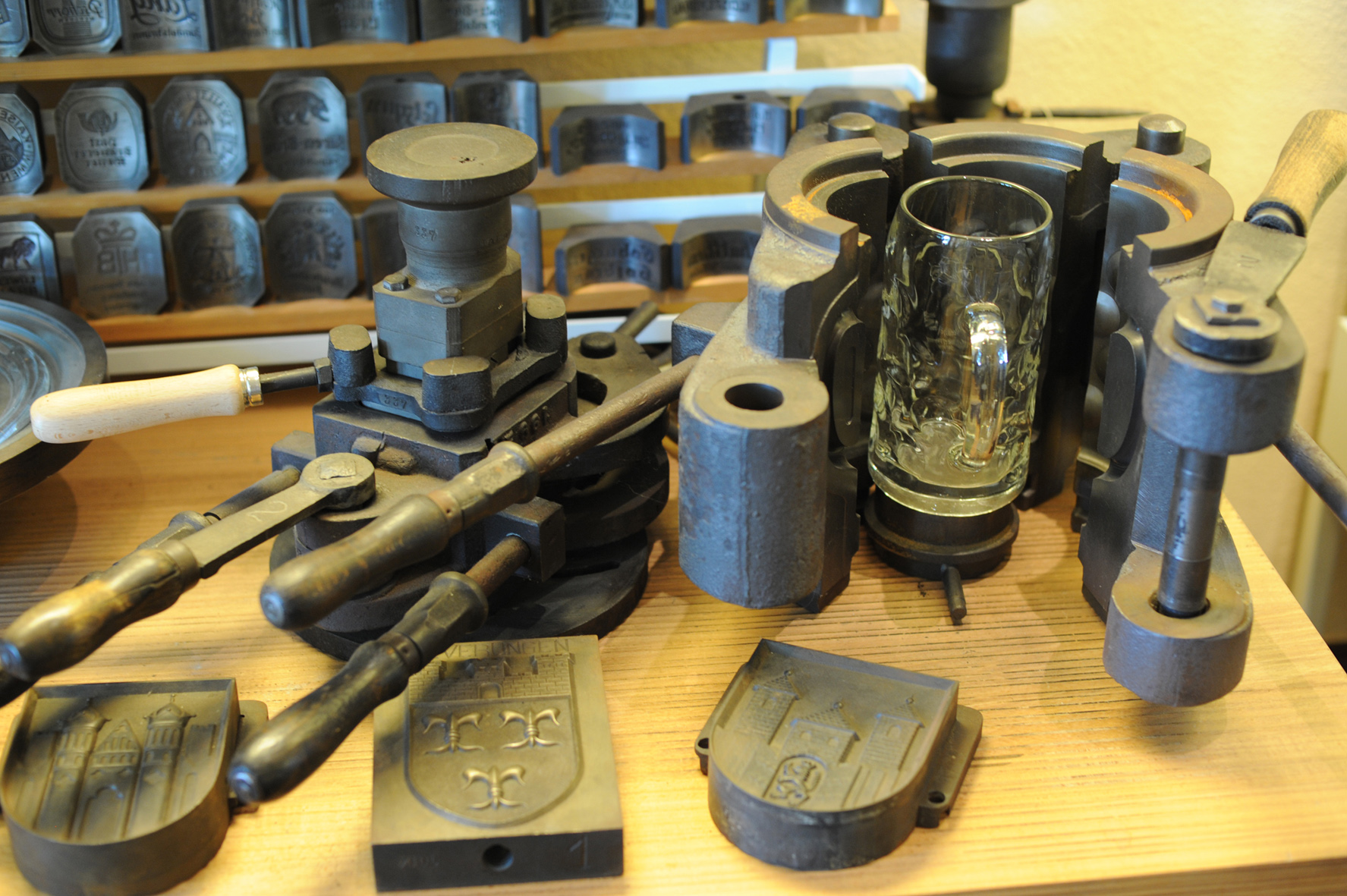 2+3: Solche Metallformen wurden für die Herstellung der Biergläser genutzt. Im Hintergrund sind die Markenzeichen der Brauereien, die jeweils in die Form eingesetzt wurden. Foto: Stefanie Waske