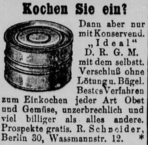 Gewerbliche Konservierung und häusliches Einmachen („Tischlein deck dich“ kein Märchen mehr, Hanau und Frankfurt a.M. 1901, 1 (l.))