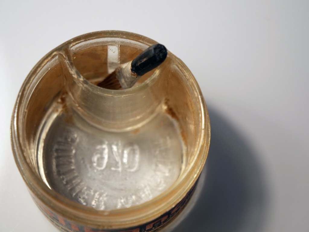 Zunächst ein Blick auf das Glas: Wer den Deckel lüftet sieht, dass innen ein abgeteiltes Fach mit einem gläsernen Steg ist. Dort findet ein kleiner Pinsel Halt: Der hätte einst im Wasser gestanden, angefeuchtet ließ sich die weiße Klebepaste – eintrocknet durch Kälte oder lange Lagerung – wieder leicht verstreichen. Das kleine praktische Detail macht jedoch aus der einfachen Form eine komplizierte. Diese wurden noch von Hand in Metallformen gepresst, der Steg machte sie anfällig für Fehler. Wer das alte Glas in die Hand nimmt, stellt fest: Es ist recht schwer. Die Marke auf dem Deckel und dessen gerillter Rand verraten, dass das Glas zwischen Ende der 1930er bis Anfang der 1950er Jahre entstanden sein muss.[1] Kurzum, das Pelikanolglas steht für das Können der Glashütte Noelle & von Campe, auch spezielle Hohlglasprodukte anzufertigen in der Zeit des Übergangs zwischen handwerklicher Produktion und zunehmend automatisierter.