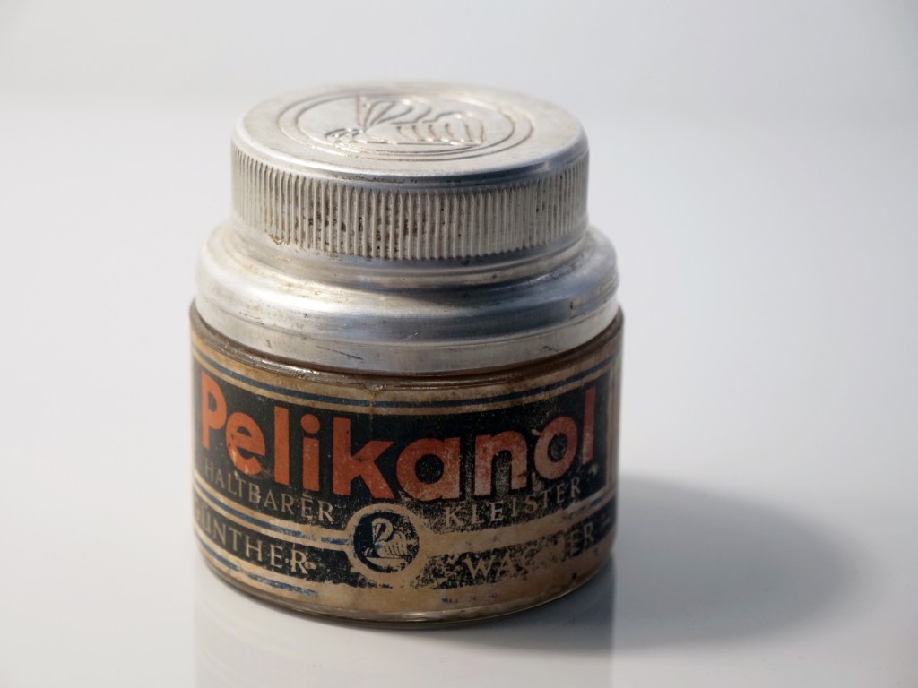 Ob Noelle & von Campe bereits diese frühen Formen herstellte, ist ungewiss. Technisch wäre dies sicher möglich gewesen, da die Glashütte damals komplexe Pressformen nutzte und einzelne auch patentieren ließ. Der hier einschlägige Zeitraum der 1930er bis 1950er Jahre deckte jedoch eindeutig die Hochzeit von Pelikanol ab. Dieses nutzen nicht nur Büroangestellte, die Briefumschläge zuklebten, sondern auch Fotografen, die mit dem säurefreien Kleber ihre Bilder in den Fotoalben befestigten. Wer mit den Kindern bastelte und es sich leisten konnte, wählte Pelikanol. 1938 verkündete der Katalog der Marke Pelikan noch ganz andere Einsatzfelder: „Auch in der Lebens- und Genußmittel-Industrie findet Pelikanol zum Verschließen von Packungen aller Art, in der Stoff- und Bekleidungs-Industrie zum Aufkleben von Etiketten, Stoffmustern und dgl. Verwendung.“[7] Dafür gab es extra große Verpackungen bis neun Kilo in Eimern aus Metall.