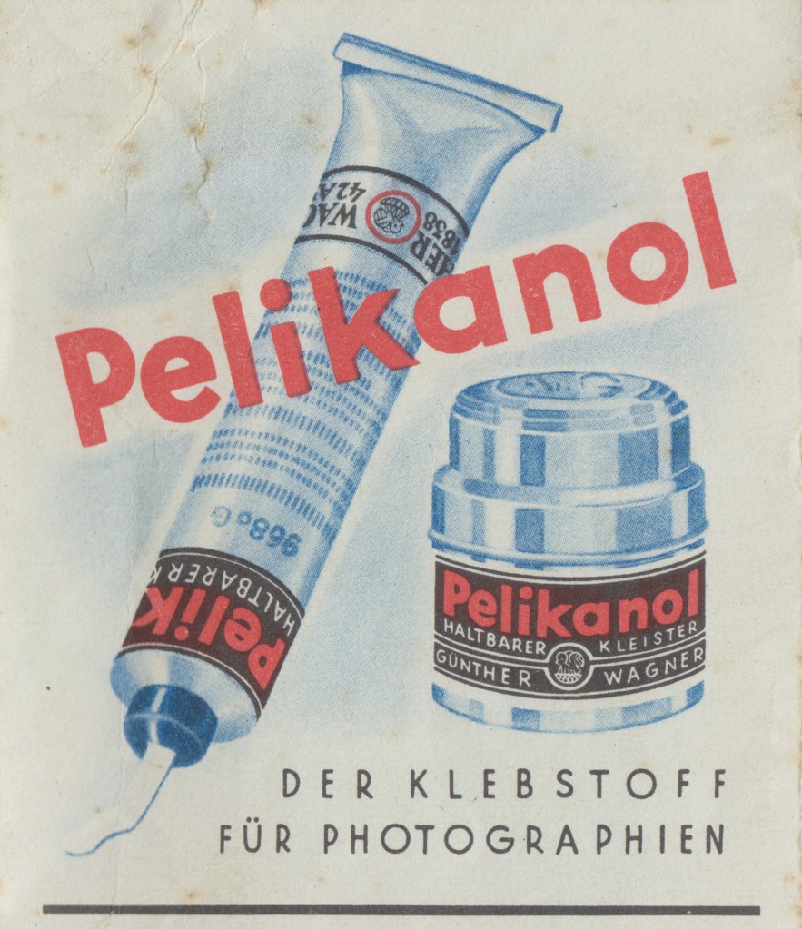 Werbung (1938) speziell für das Aufkleben von Fotografien. Der Kleber sollte „archivsicher“ sein, also zu keinen Farbveränderungen führen. Foto: Archiv Freundeskreis Glas