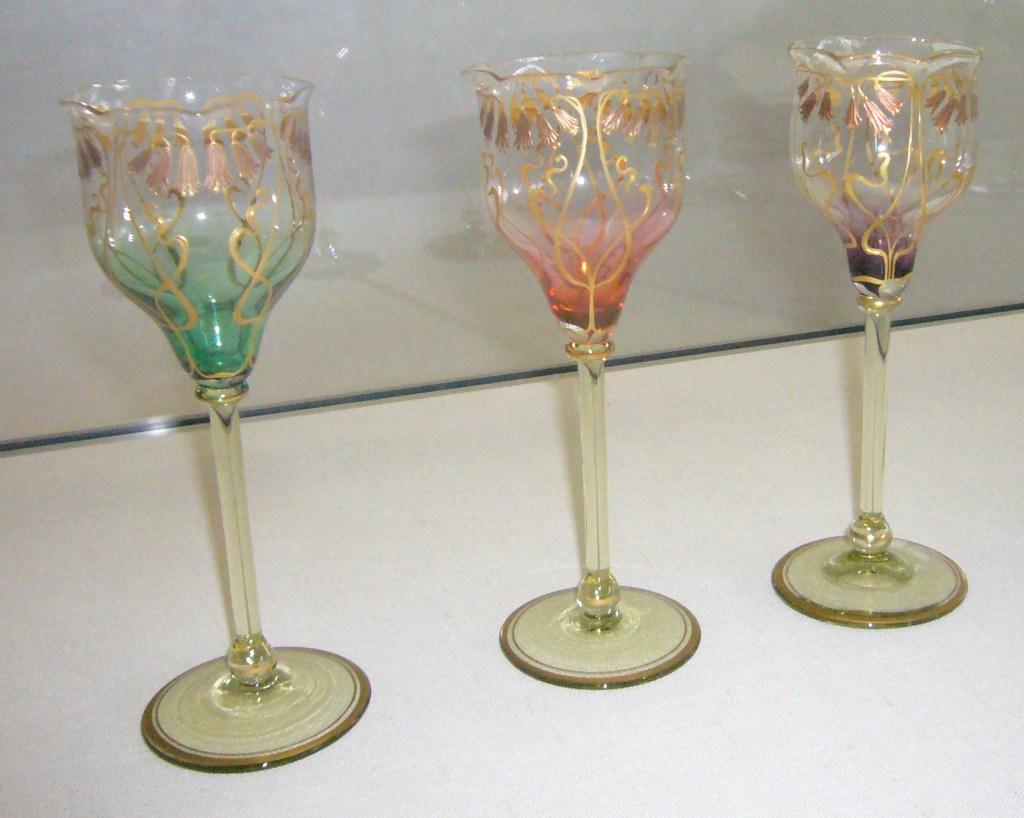 Die beiden Fotos von der Ausstellungseröffnung zeigen vergoldete und farbig gestaltete Gläser – deren Zartheit und technische Virtuosität bis heute besticht. Trinkgläser und Vasen wurden mit Raffinesse und Sachverstand immer wieder umgestaltet, um in den Kabinetten und auf den Tafeln ihren Platz zu finden – schließlich waren Historismus und Jugendstil auch Gestaltungsmoden im Hinblick auf einen wachsenden Markt in Europa und dann auch den USA.