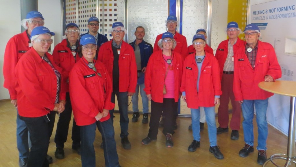 Die Gruppe aus Boffzen und Umgebung wurde in Grünenplan vom Anwendungsingenieur Arne Lange begrüßt, seit 1998 bei Schott aktiv. Es folgte keiner der gängigen und manchmal gefürchteten Firmenfilme. Stattdessen gab der Standortleiter Alexander Glacki pointierte Einblicke in das Profil und die Produkte der Schott AG: 2022/23 erzielten weltweit 17.100 Mitarbeiter einen Umsatz von 2,9 Mrd. und einen Nettogewinn von 277 Mio. €. In Grünenplan konzentriere man sich auf Dünnglas und dessen Nachverarbeitung, ebenso auf Dekorationen. Drei Werke gäbe es vor Ort, nämlich Schmelzerei, Nachverarbeitung und Logistik und schließlich im nahegelegenen Eschershausen eine Werkstätte für Flach- und Strahlenglas. Auf 115.000 m² Betriebsfläche arbeiten nicht weniger als 430 Menschen. Man merkte beim Standortleiter Freude an der steten Innovation als er auf den Wandel vor Ort einging: Brillenglas, gezogenes Flachglas nach dem Verfahren des Belgiers Emile Fourcault (1862-1919), neue Deckgläser für die Mikroskopie. Seit der Einführung der Down-Drow-Technologie, also dem nach unten gerichteten Ziehen des in kleinen Wannen geschmolzenen Glases, begann in den 1990er Jahren dünnes Glas zu dominieren, sei es für Bildschirme, sei es für tragbare Telefone. Das heutige Ultradünnglas stelle den nächsten Schritt permanenter Innovation dar. Stolz auf das Erreichte prägten Glackis Worte.