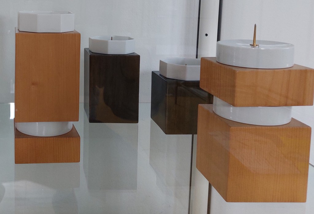 Leuchterbaukasten, Designstudie für VEB Kunstgewerbe-Werkstätten Olbernhau; Holz, Glas, Porzellan, 1977/78.