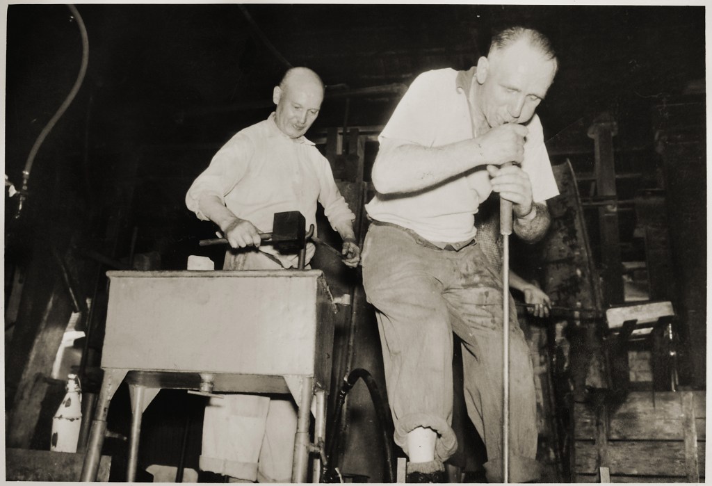 August Ohm (links) und Hermann Böker an der Mundblaswanne Foto: Willi Ohm